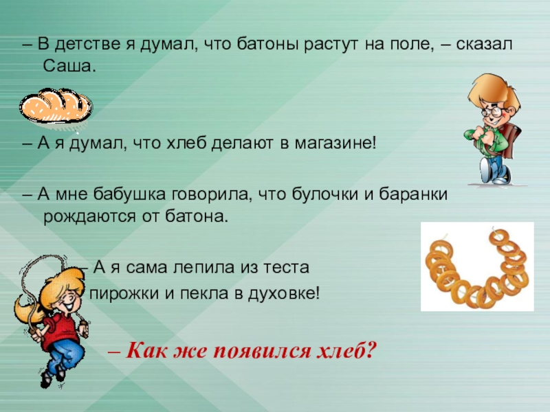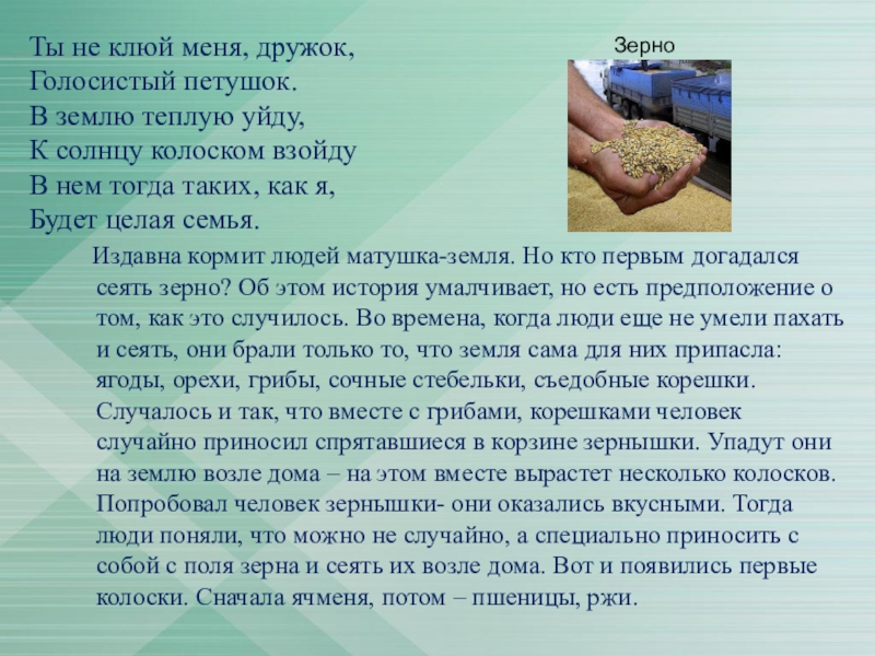 Издавна кормит людей матушка-земля. Но кто первым догадался сеять зерно? Об этом история умалчивает, но есть предположение о том, как это случилось. Во времена, когда люди еще не умели пахать и сеять, они брали только то, что земля сама для них припасла: ягоды, орехи, грибы, сочные стебельки, съедобные корешки. Случалось и так, что вместе с грибами, корешками человек случайно приносил спрятавшиеся в корзине зернышки. Упадут они на землю возле дома – на этом вместе вырастет несколько колосков. Попробовал человек зернышки- они оказались вкусными. Тогда люди поняли, что можно не случайно, а специально приносить с собой с поля зерна и сеять их возле дома. Вот и появились первые колоски. Сначала ячменя, потом – пшеницы, ржи.