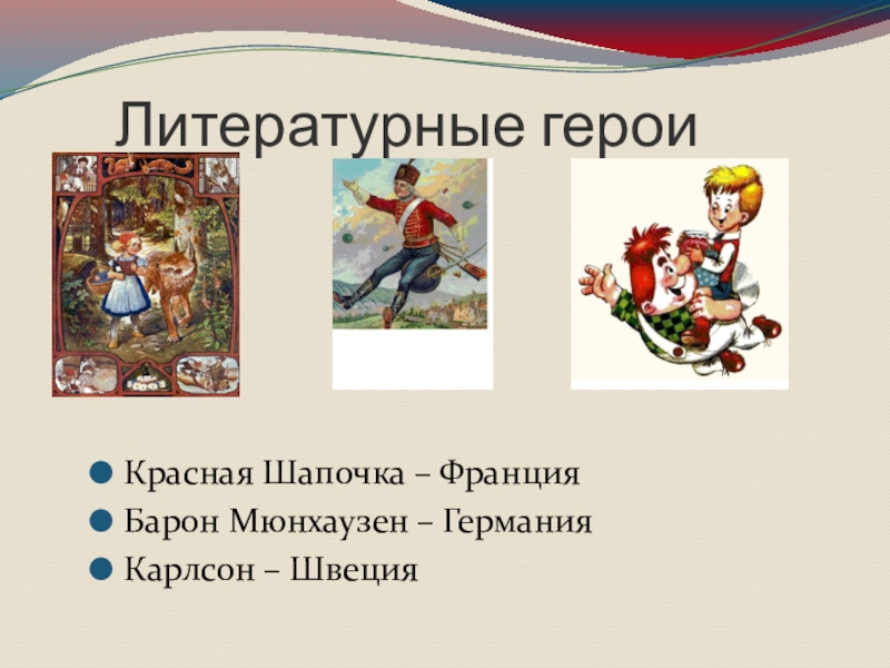 Литературные героиКрасная Шапочка – ФранцияБарон Мюнхаузен – ГерманияКарлсон – Швеция