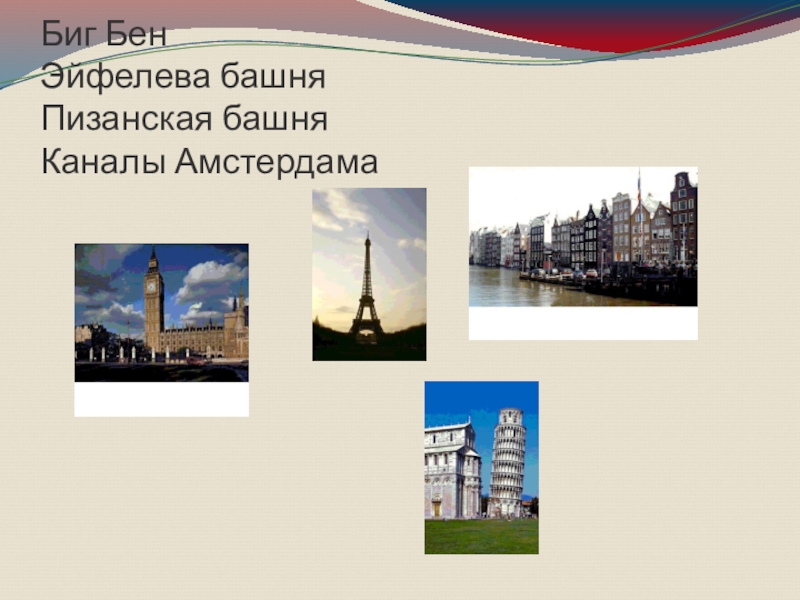 Биг Бен Эйфелева башня Пизанская башня Каналы Амстердама