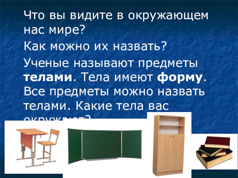 Что вы видите в окружающем нас мире?Как можно их назвать?Ученые называют предметы телами. Тела имеют форму. Все предметы можно назвать телами. Какие тела вас окружают?
