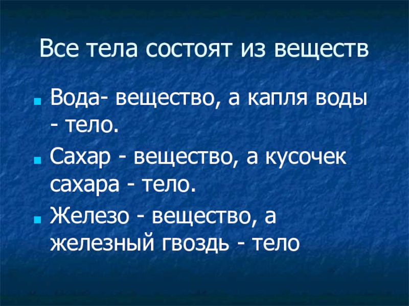Все тела состоят из веществВода- вещество, а капля воды - тело. Сахар - вещество, а кусочек сахара