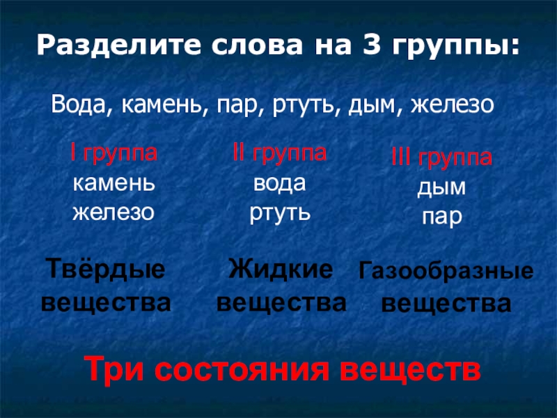 Разделите слова на 3 группы:I группакаменьжелезоII группаводартутьIII группадымпарТвёрдыевеществаЖидкиевеществаГазообразные веществаТри состояния веществВода, камень, пар, ртуть, дым, железо