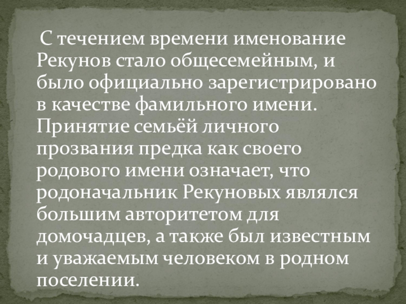 Слайд 5 С течением времени именование Рекунов стало общесемейным, и было