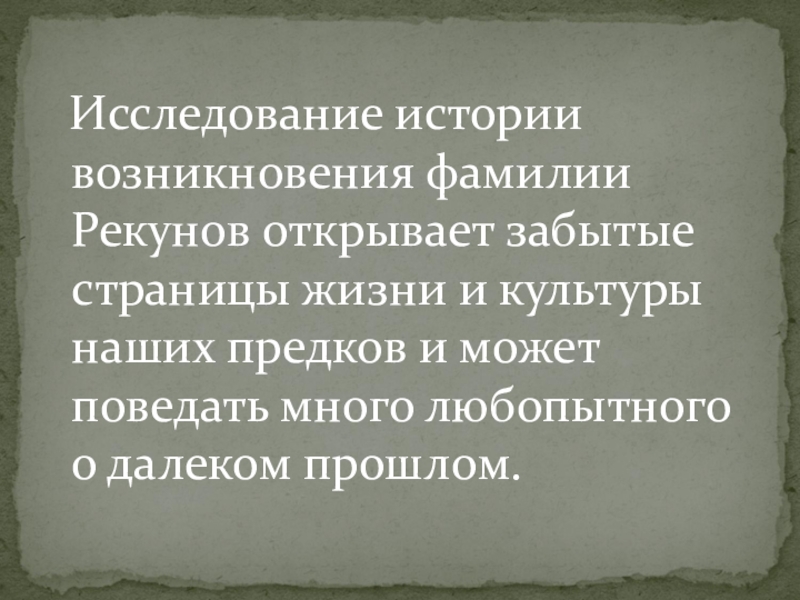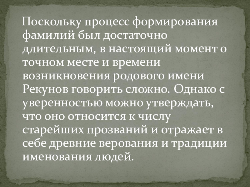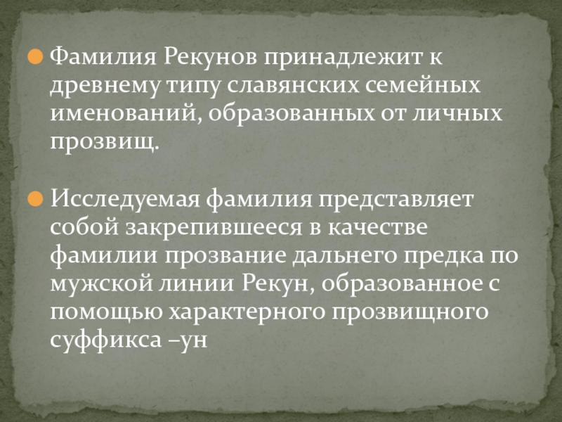 Слайд 3Фамилия Рекунов принадлежит к древнему типу славянских семейных именований, образованных от