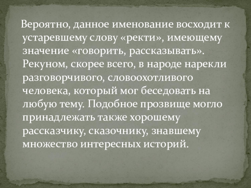 Вероятно, данное именование восходит к устаревшему слову «ректи», имеющему значение «говорить, рассказывать». Рекуном, скорее всего, в