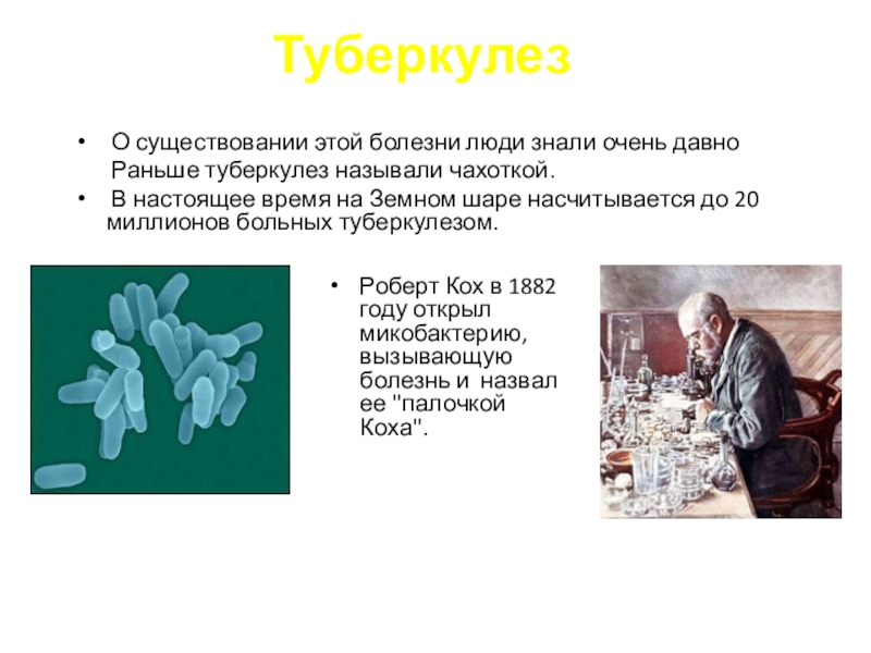 Роберт Кох в 1882 году открыл микобактерию, вызывающую болезнь и назвал ее "палочкой Коха".