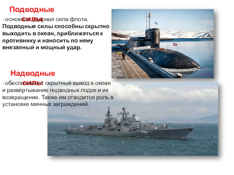 - обеспечивают скрытный выход в океан и развёртывание подводных лодок и их возвращение. Также им отводится роль в установке минных заграждений.