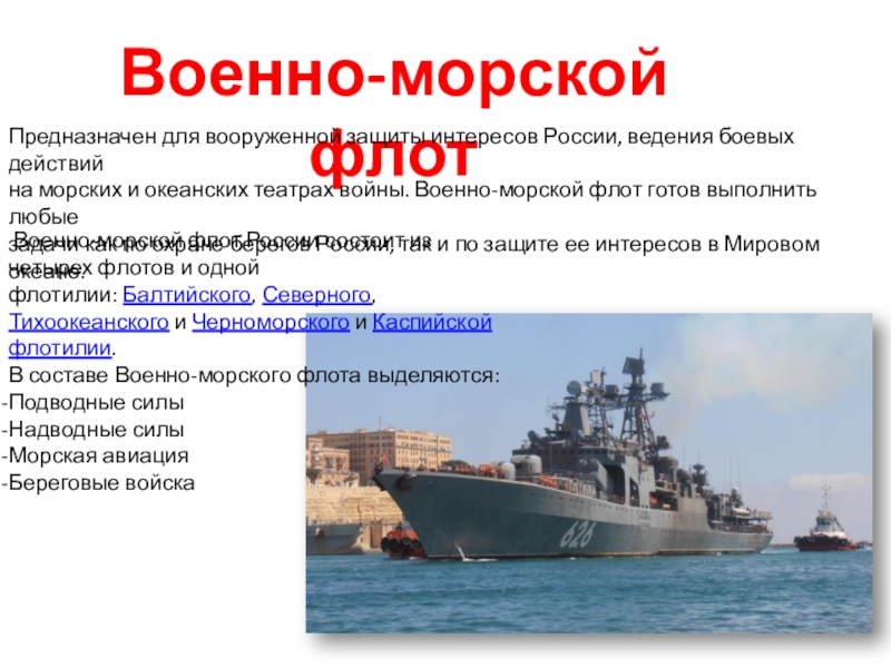 Военно-морской флот России состоит из четырех флотов и одной флотилии: Балтийского, Северного, Тихоокеанского и Черноморского и Каспийской флотилии.