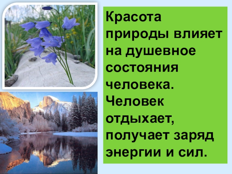 Слайд 11Красота природы влияет на душевное состояния человека. Человек отдыхает, получает заряд
