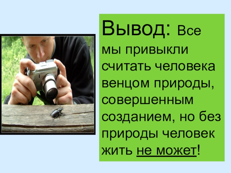 Вывод: Все мы привыкли считать человека венцом природы, совершенным созданием, но без природы человек жить не может!