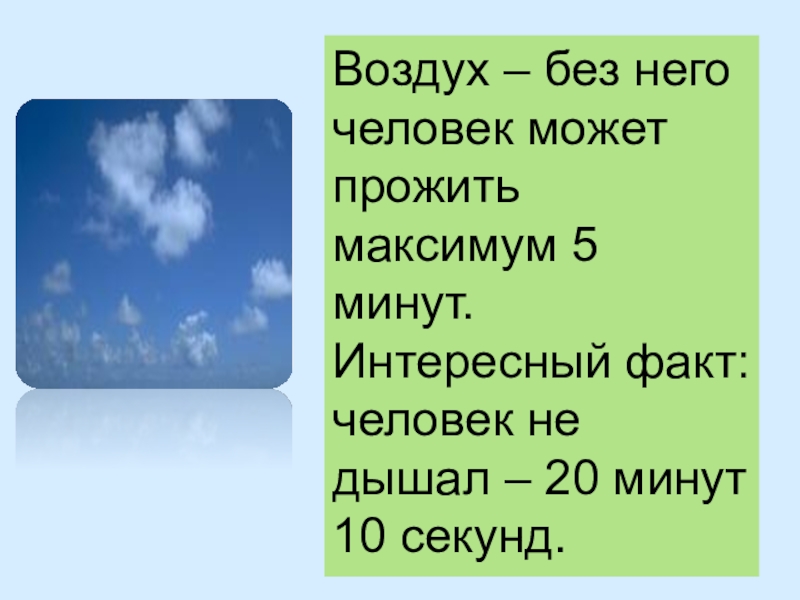 Слайд 6Воздух – без него человек может прожить максимум 5 минут.