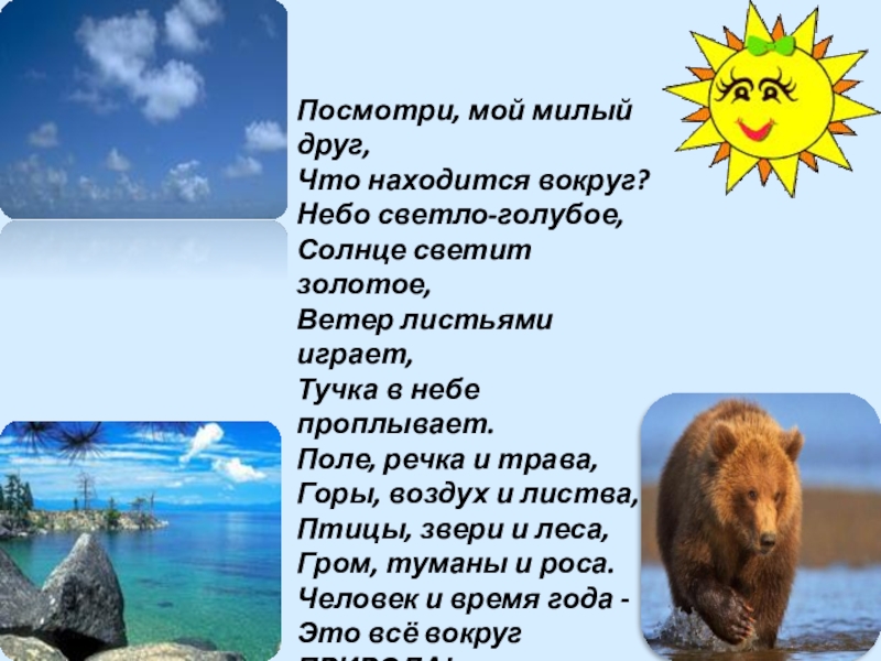 Посмотри, мой милый друг, Что находится вокруг? Небо светло-голубое, Солнце светит золотое, Ветер листьями играет, Тучка в небе проплывает. Поле, речка и трава, Горы, воздух и листва, Птицы, звери и леса, Гром, туманы и роса.