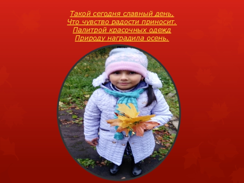 Такой сегодня славный день, Что чувство радости приносит. Палитрой красочных одежд Природу наградила осень.