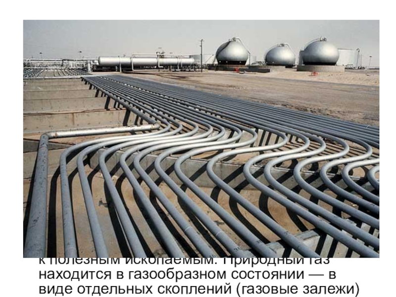 Природный газ относится к полезным ископаемымПриродный газ относится к полезным ископаемым. Природный газ находится в газообразном состоянии — в виде отдельных скоплений (газовые залежи) или в виде газовой шапки нефтегазовых месторождений, либо в растворённом состоянии в нефтиПриродный газ относится к полезным ископаемым. Природный газ находится в газообразном состоянии — в виде отдельных скоплений (газовые залежи) или в виде газовой шапки нефтегазовых месторождений, либо в растворённом состоянии в нефти или воде. Также природный газ может находиться в кристаллическом состоянии.