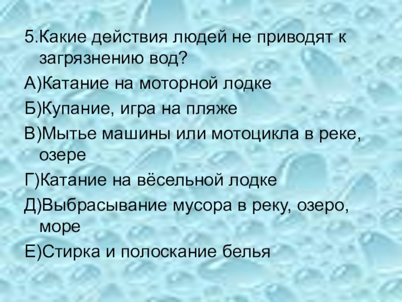 Слайд 65.Какие действия людей не приводят к загрязнению вод?