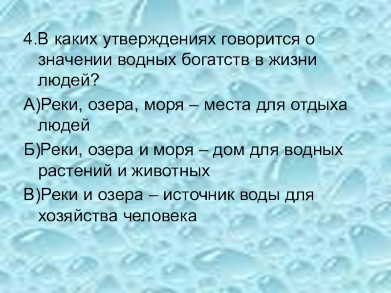 Слайд 54.В каких утверждениях говорится о значении водных богатств в жизни людей?