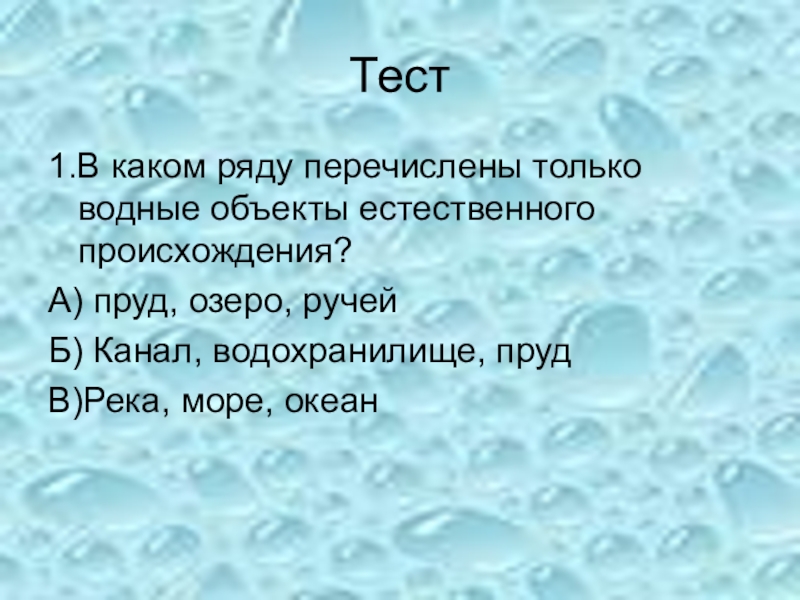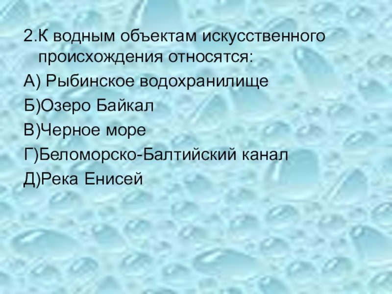 Слайд 32.К водным объектам искусственного происхождения относятся: