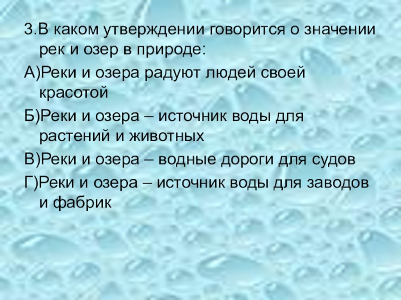 Слайд 43.В каком утверждении говорится о значении рек и озер в природе: