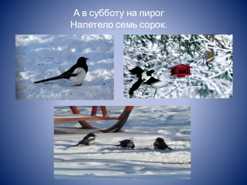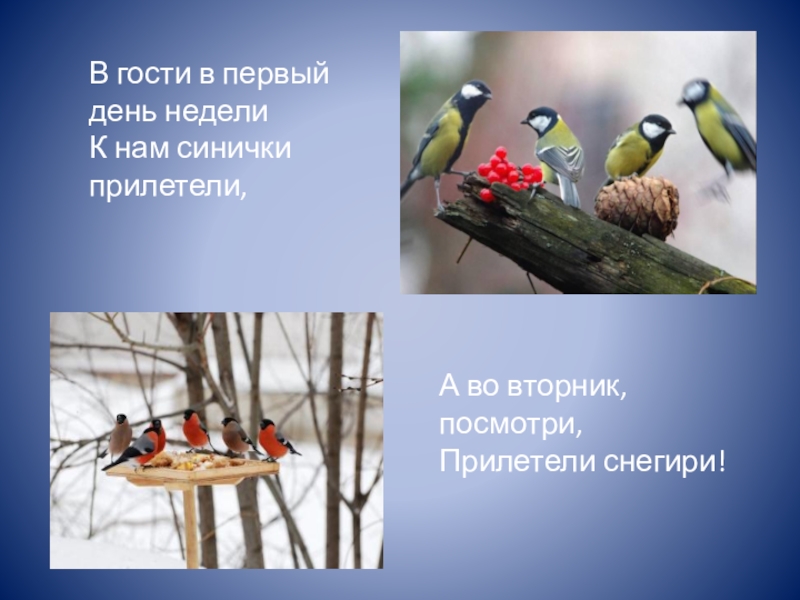 В гости в первый день неделиК нам синички прилетели,А во вторник, посмотри, Прилетели снегири!