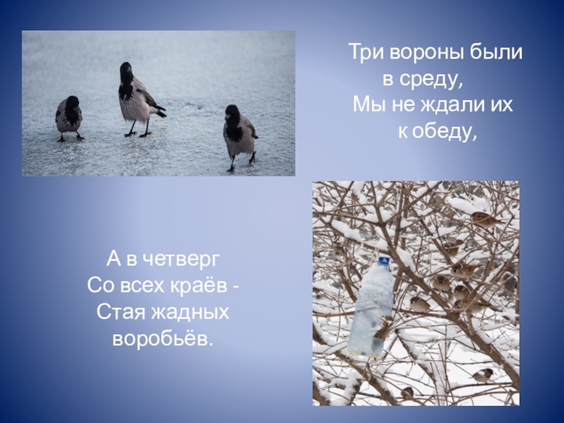 Мы кормушки смастерили,Мы столовую открыли, Воробей, снегирь – сосед,Будет вам зимой обед!