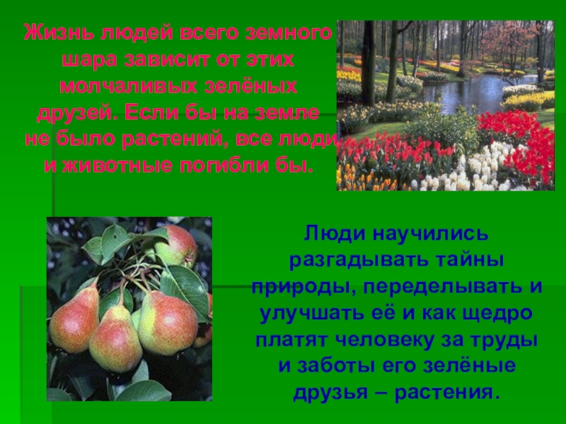 Люди научились разгадывать тайны природы, переделывать и улучшать её и как щедро платят человеку за труды и заботы его зелёные друзья – растения.