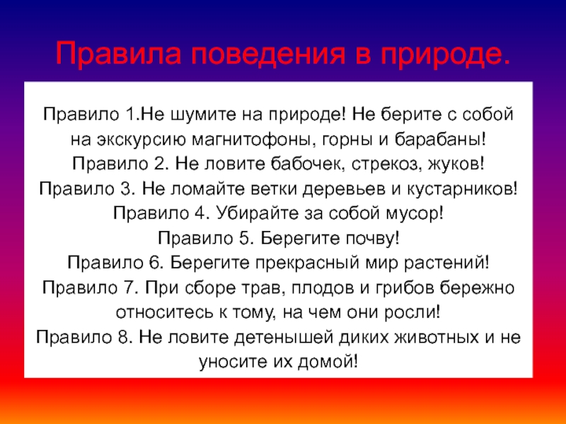 Правила поведения в природе.	Правило 1.Не шумите на природе! Не берите с собой на экскурсию магнитофоны, горны и