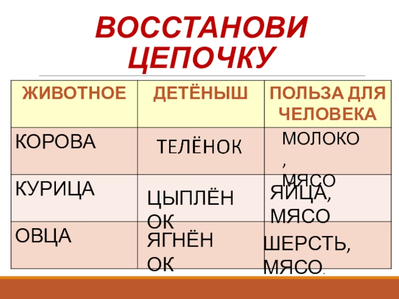 ВОССТАНОВИ ЦЕПОЧКУМОЛОКО, МЯСО ЦЫПЛЁНОКЯЙЦА, МЯСОЯГНЁНОКШЕРСТЬ, МЯСО.