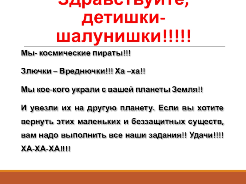 Здравствуйте, детишки-шалунишки!!!!!Мы- космические пираты!!! Злючки – Вреднючки!!! Ха –ха!! Мы кое-кого украли с вашей планеты Земля!! И увезли их на другую планету. Если вы хотите вернуть этих маленьких и беззащитных существ, вам надо выполнить все наши