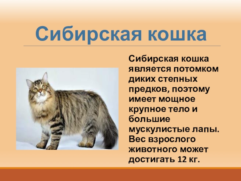 Сибирская кошка является потомком диких степных предков, поэтому имеет мощное