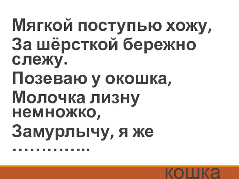 Мягкой поступью хожу,За шёрсткой бережно слежу.Позеваю у окошка,Молочка лизну немножко,Замурлычу, я же …………..кошка