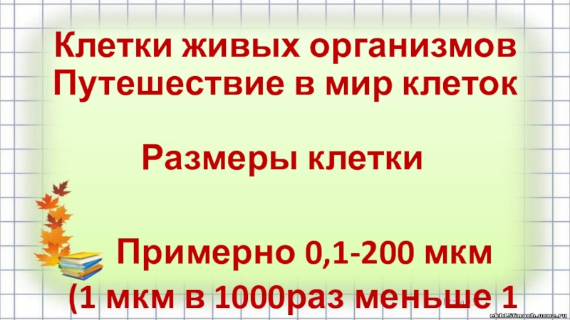 Клетки живых организмов Путешествие в мир клеток Размеры клеткиПримерно 0,1-200 мкм  (1 мкм в 1000раз меньше