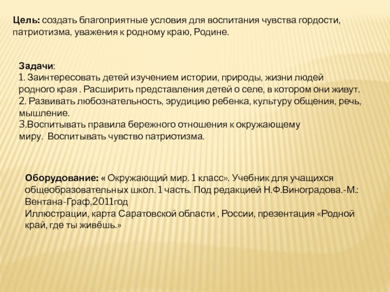Цель: Создать благоприятные условия для воспитания чувства гордости, патриотизма, уважения к родному краю, Родине.