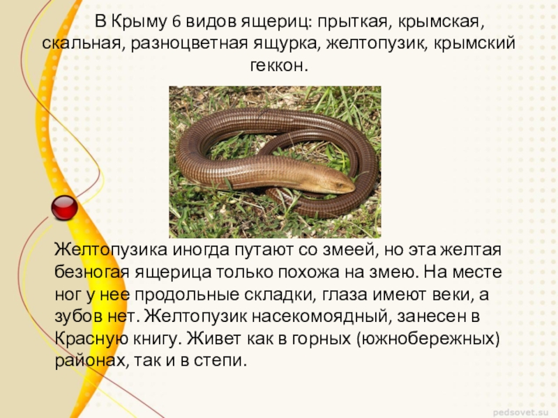 Желтопузика иногда путают со змеей, но эта желтая безногая ящерица только похожа на змею. На месте ног у нее продольные складки, глаза имеют веки, а зубов нет. Желтопузик насекомоядный, занесен в Красную книгу. Живет как в горных (южнобережных) районах, так и в степи.