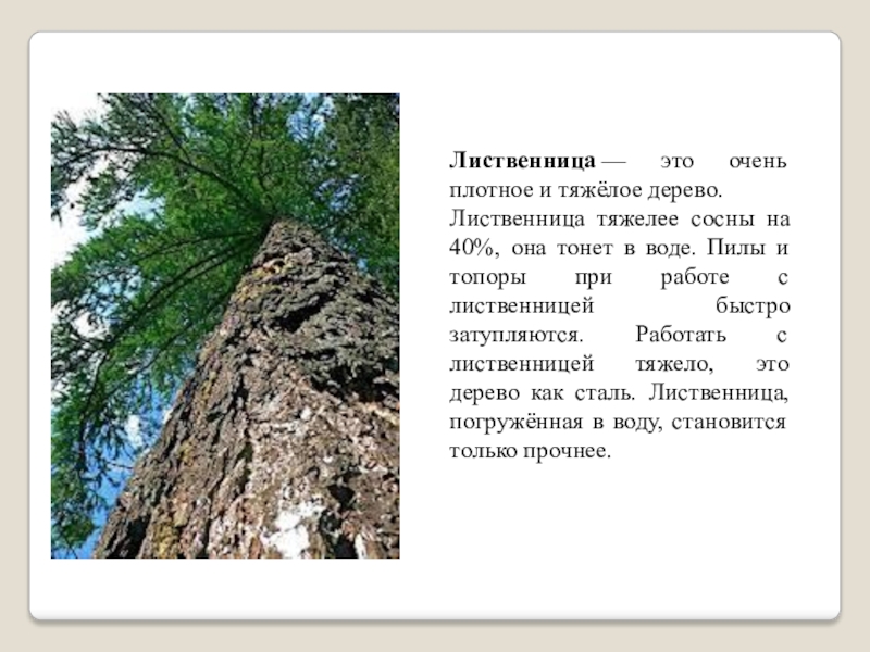 Слайд 11Лиственница — это очень плотное и тяжёлое дерево.