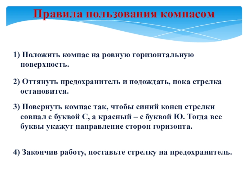 3) Повернуть компас так, чтобы синий конец стрелки совпал с буквой С, а красный – с буквой Ю. Тогда все буквы укажут направление сторон горизонта.