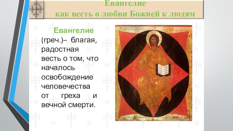Евангелие  как весть о любви Божией к людям 		Евангелие (греч.)– благая, радостная весть о том, что