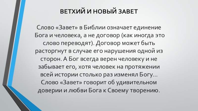 ВЕТХИЙ И НОВЫЙ ЗАВЕТ  Слово «Завет» в Библии означает единение Бога и человека, а не