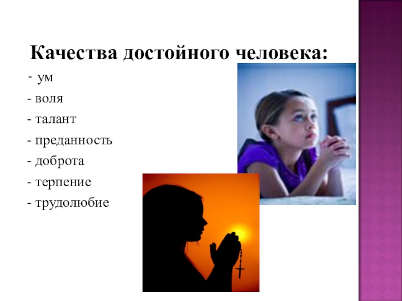 Качества достойного человека: - ум - воля - талант - преданность - доброта - терпение - трудолюбие