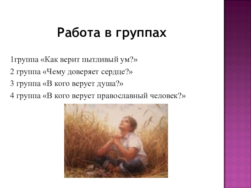Работа в группах1группа «Как верит пытливый ум?»2 группа «Чему доверяет сердце?»3 группа «В кого верует душа?»4 группа