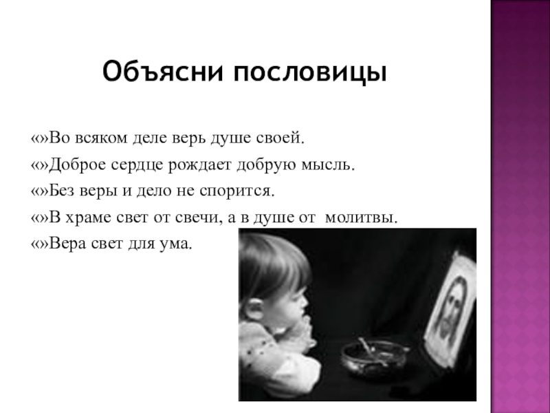 Объясни пословицы«»Во всяком деле верь душе своей.«»Доброе сердце рождает добрую мысль.«»Без веры и дело не спорится.«»В храме