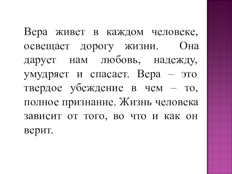 любовь, надежду, умудряет и спасает. Вера – это твердое убеждение в чем – то, полное признание. Жизнь человека зависит от того, во что и как он верит.