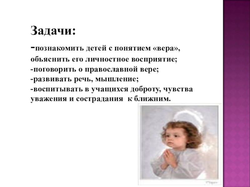 Слайд 3 Задачи: -познакомить детей с понятием «вера», объяснить его личностное восприятие; -поговорить о православной