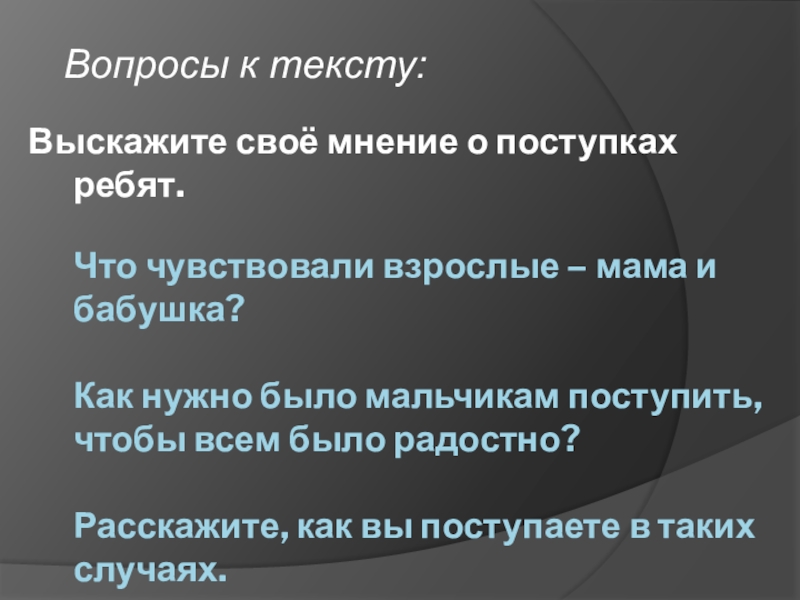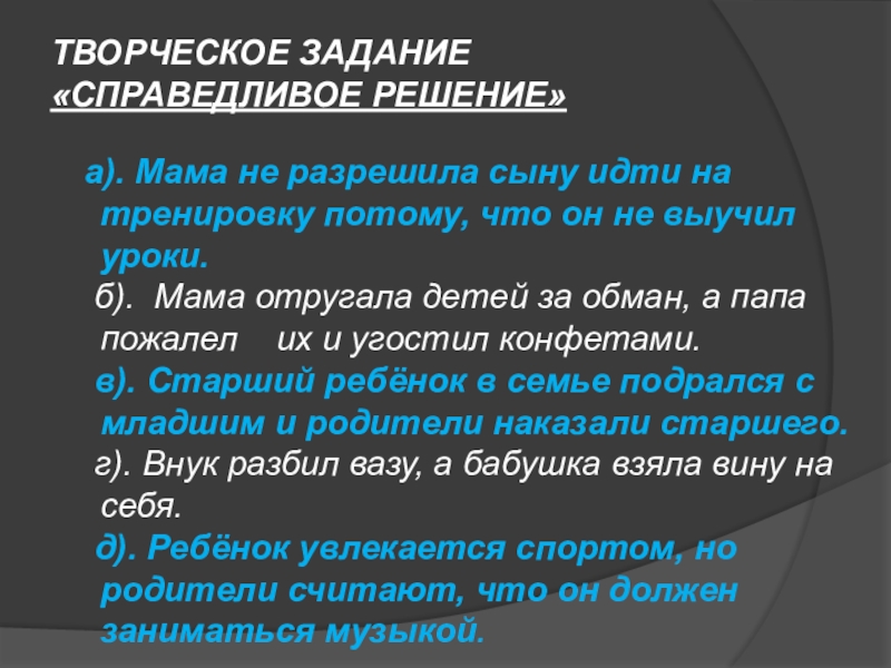 б). Мама отругала детей за обман, а папа пожалел их и угостил конфетами.