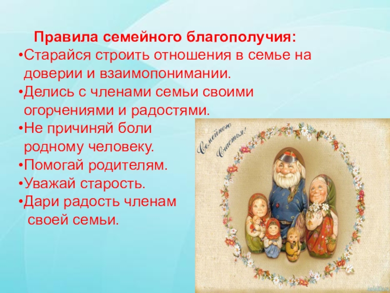 Старайся строить отношения в семье на доверии и взаимопонимании.