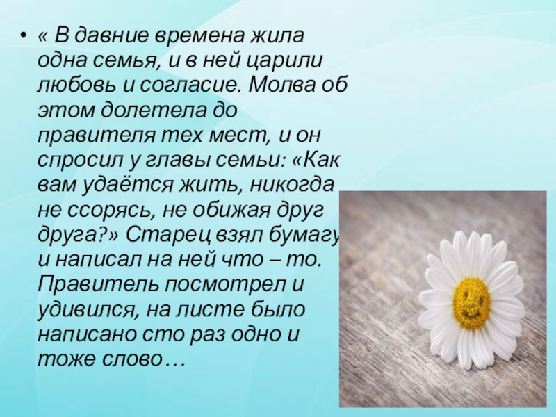 любовь и согласие. Молва об этом долетела до правителя тех мест, и он спросил у главы семьи: «Как вам удаётся жить, никогда не ссорясь, не обижая друг друга?» Старец взял бумагу и написал на ней что – то. Правитель посмотрел и удивился, на листе было написано сто раз одно и тоже слово…