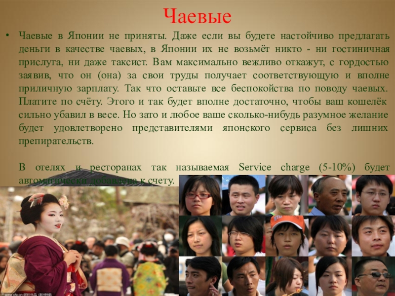 деньги в качестве чаевых, в Японии их не возьмёт никто - ни гостиничная прислуга, ни даже таксист. Вам максимально вежливо откажут, с гордостью заявив, что он (она) за свои труды получает соответствующую и вполне приличную зарплату. Так что оставьте все беспокойства по поводу чаевых. Платите по счёту. Этого и так будет вполне достаточно, чтобы ваш кошелёк сильно убавил в весе. Но зато и любое ваше сколько-нибудь разумное желание будет удовлетворено представителями японского сервиса без лишних препирательств.