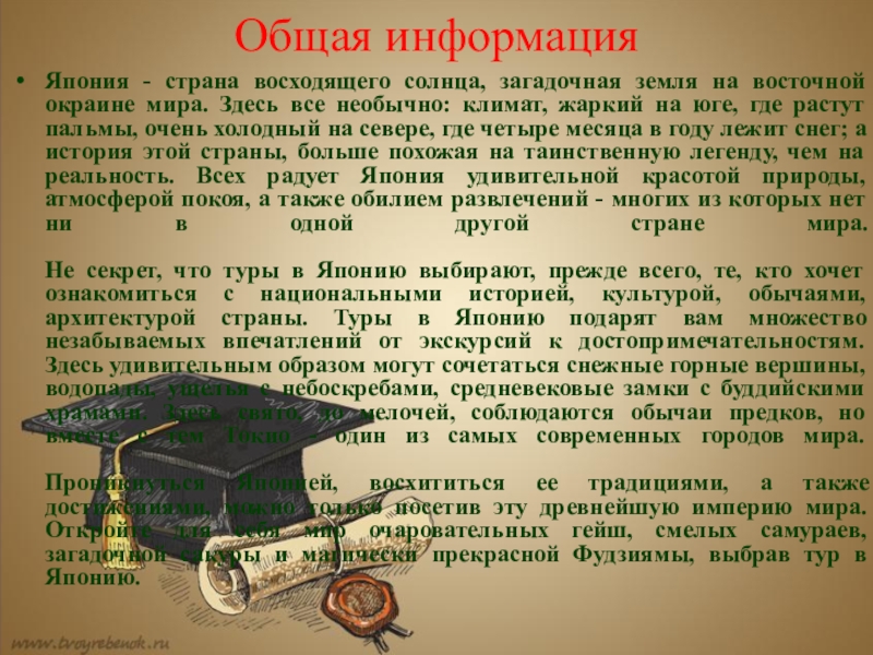 мира. Здесь все необычно: климат, жаркий на юге, где растут пальмы, очень холодный на севере, где четыре месяца в году лежит снег; а история этой страны, больше похожая на таинственную легенду, чем на реальность. Всех радует Япония удивительной красотой природы, атмосферой покоя, а также обилием развлечений - многих из которых нет ни в одной другой стране мира.
