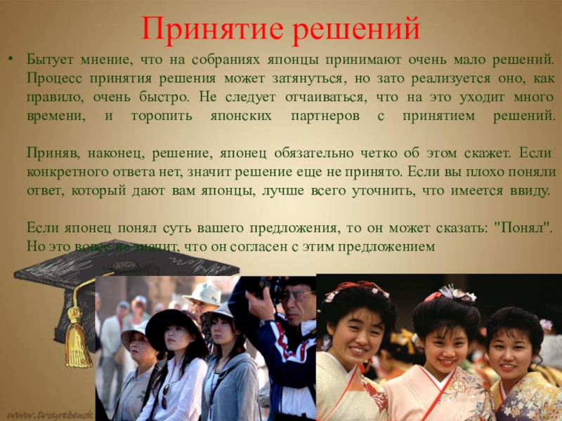 Приняв, наконец, решение, японец обязательно четко об этом скажет. Если конкретного ответа нет, значит решение еще не принято. Если вы плохо поняли ответ, который дают вам японцы, лучше всего уточнить, что имеется ввиду.