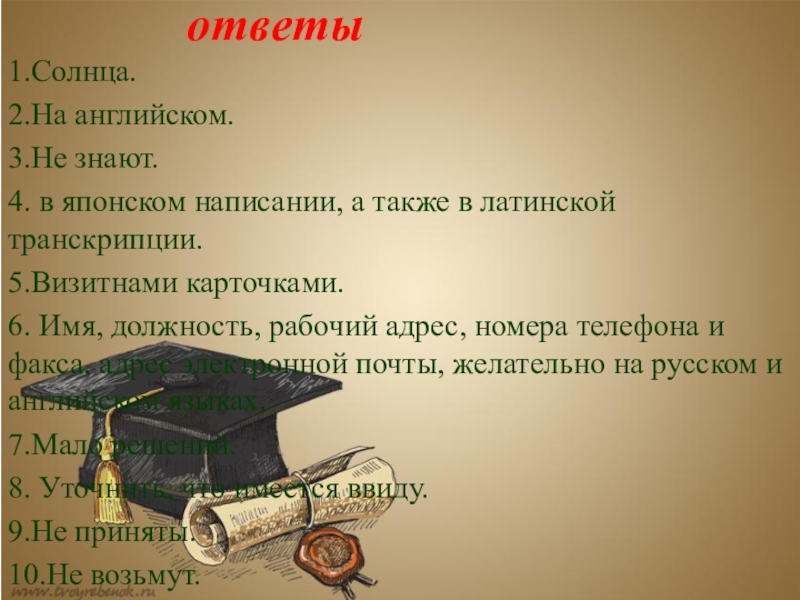 Поэтому для общения с японцами очень важно обзавестись такой карточкой, особенно тем, кто занимается бизнесом. На визитной карточке должно быть указано имя, должность, рабочий адрес, номера телефона и факса, адрес электронной почты, желательно на русском и английском языках.