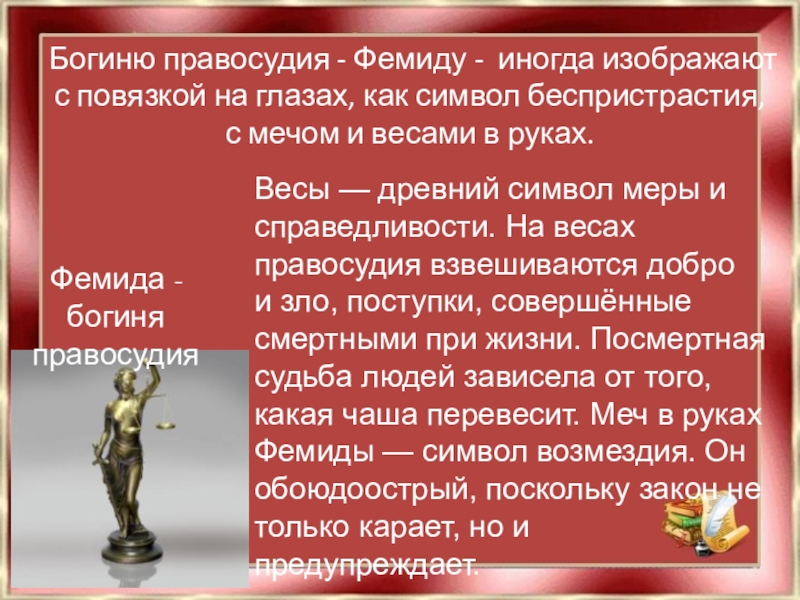 и зло, поступки, совершённые смертными при жизни. Посмертная судьба людей зависела от того, какая чаша перевесит. Меч в руках Фемиды — символ возмездия. Он обоюдоострый, поскольку закон не только карает, но и предупреждает.